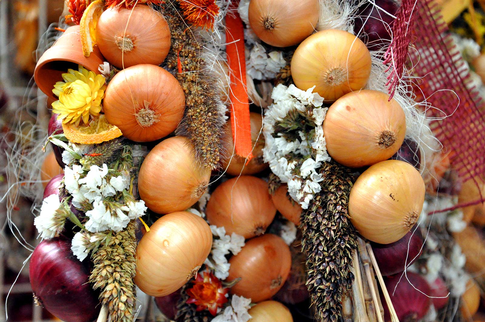 Das beliebteste „Mitbringsel“ vom Zwiebelmarkt ist und bleibt der kunstvoll geflochtene Zwiebelzopf, den es in verschiedenen Designs, Größen und Farben gibt.