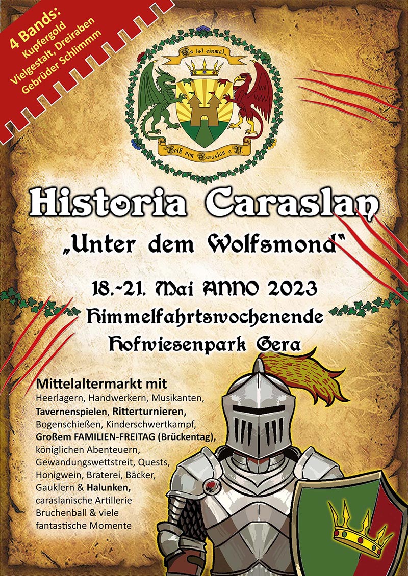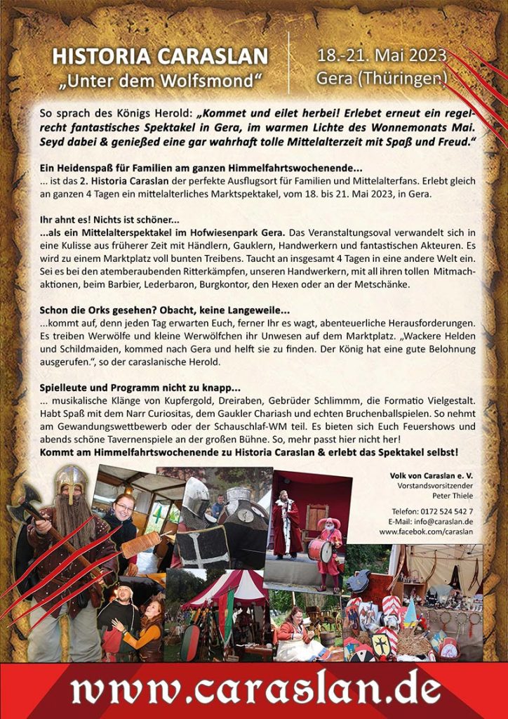 Am Himmelfahrtswochenende wird es zum dritten Mal Mittelalter-Fantastisch. Der Verein „Volk von Caraslan“ e.V. lädt zum 4. Historia Caraslan in den Hofwiesenpark Gera.