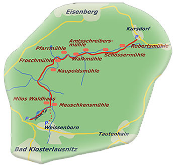 Das Eisenberger Mühltal liegt im Thüringer Holzland zwischen der Stadt Eisenberg im Norden und Bad Klosterlausnitz im Süden. Die kleinen Orte, die das Mühltal begrenzen, sind Kursdorf und Weißenborn .