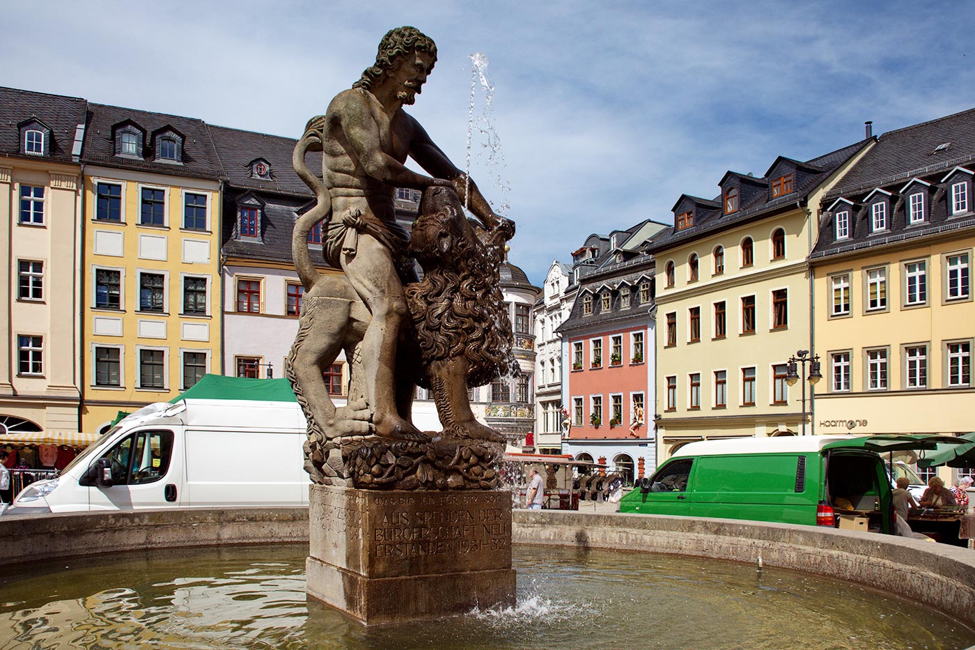 Er steht in der Mitte des Geraer Marktplatzes: Der Simson Brunnen.
