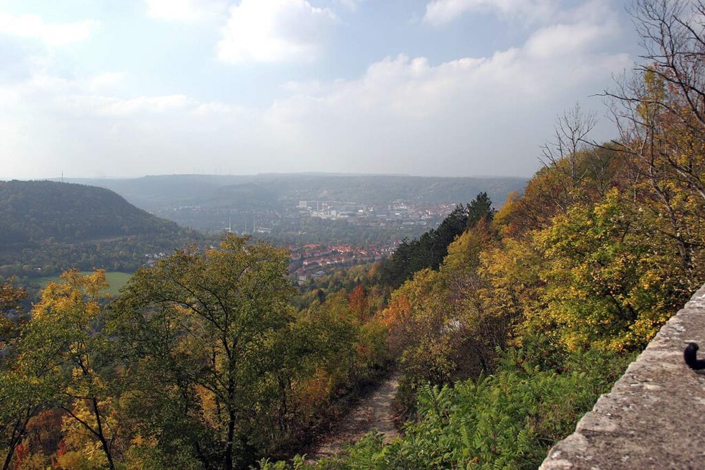 Herbstlicher Blick vom Fuß des Fuchsturms auf Jena